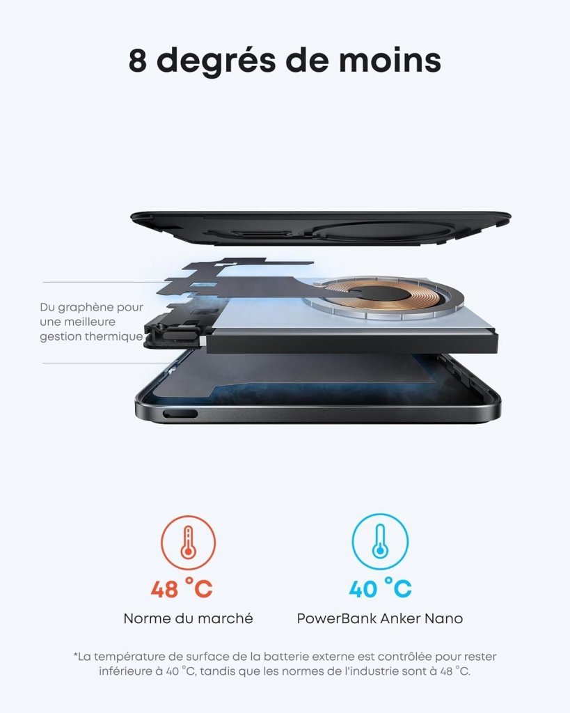 - Charge MagSafe compatible 15 W : la PowerBank Anker Nano offre une charge haute performance pour les téléphones portables. Votre iPhone 16 Pro passe de 0 à 25 % en 42 minutes seulement. (Données basées sur des tests internes en laboratoire. Les performances réelles peuvent varier.)