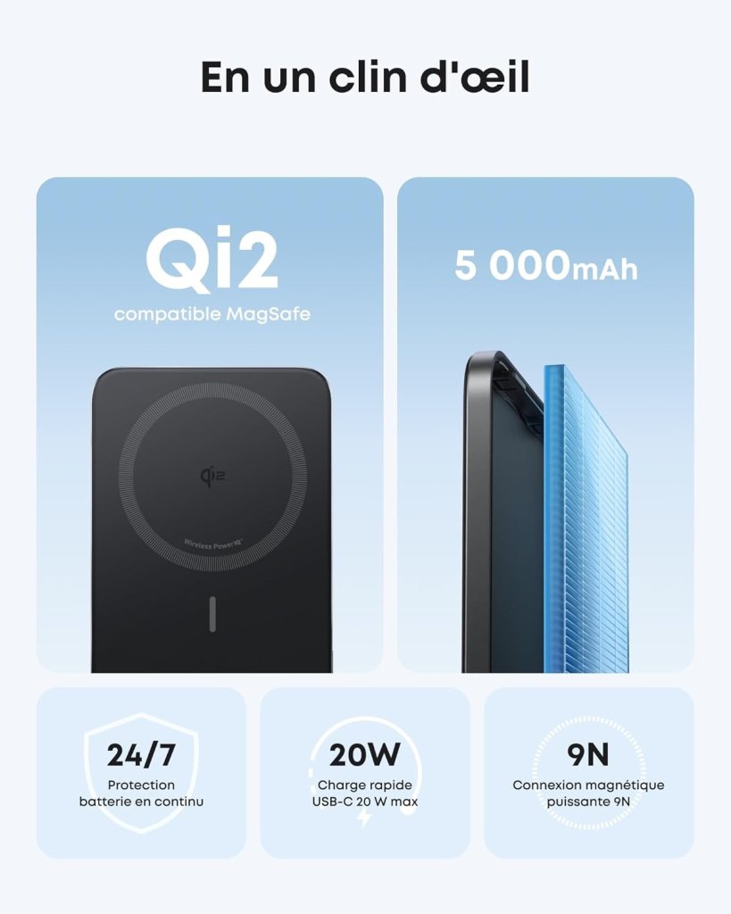 - PowerBank magnétique compatible Qi2 : cette batterie externe ultra-fine ne mesure que 0,76 cm d’épaisseur et fournit 5 000 mAh à vos appareils, pour une charge toujours fiable.