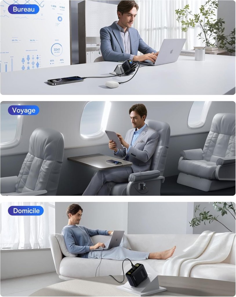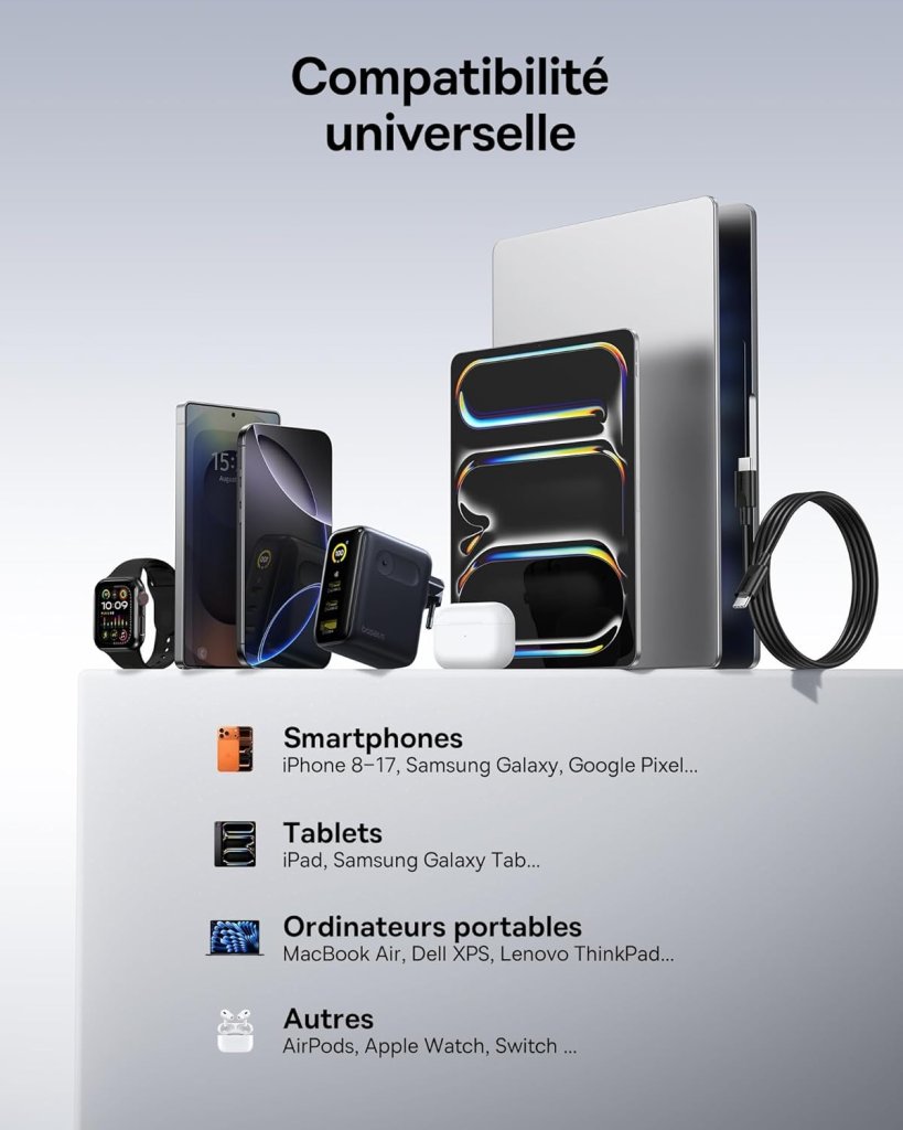 - Charge Ultra-Rapide 100W : Chacun des deux ports USB-C délivre jusqu’à 100W de puissance, rechargeant un MacBook Air à 56 % en seulement 30 minutes et un iPhone 17 à 55 % en 20 minutes.