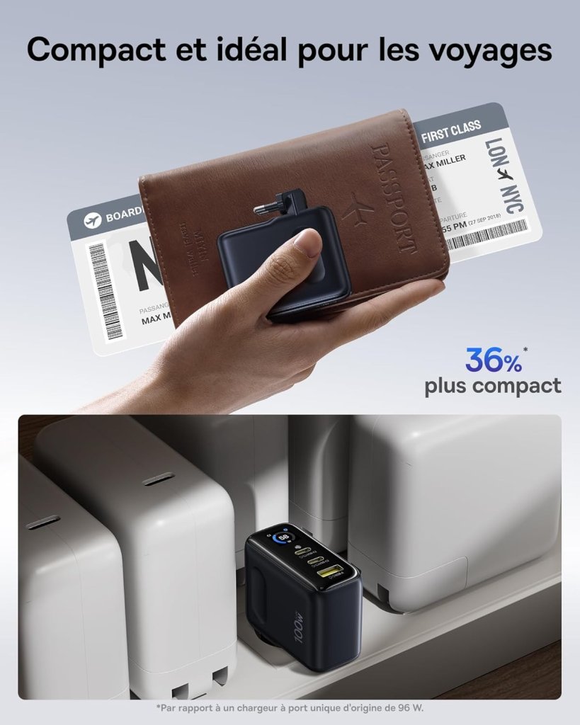 - Compact et Pliable – Prêt pour le Voyage : 36 % plus petit que les chargeurs classiques, avec une prise pliable qui se glisse facilement dans un sac ou une poche. Parfait à la maison, au bureau ou en voyage.