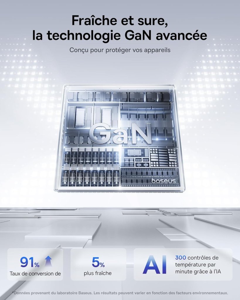 - Refroidissement Efficace : Grâce à la technologie GaN avancée, il offre une efficacité accrue et une chaleur réduite. La technologie Baseus Cooling (BCT) à intelligence artificielle surveille la température 2000 fois par seconde pour une protection fiable.