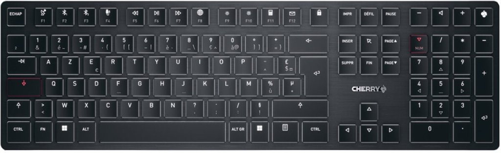 - Rétro-éclairage des touches : Rétro-éclairage des touches blanc et esthétique et LED d’autres couleurs pour les touches d’état et les touches spéciales (+ LED RVB pour la touche CHERRY qui indique le niveau de charge)