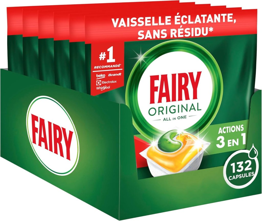 Bon plan ! Le lot de 132 tablettes lave-vaisselle Fairy Original Tout-en-1 (22×6) passe à 16,47€ au lieu de 30,50€ en option Prévoyez et Economisez.