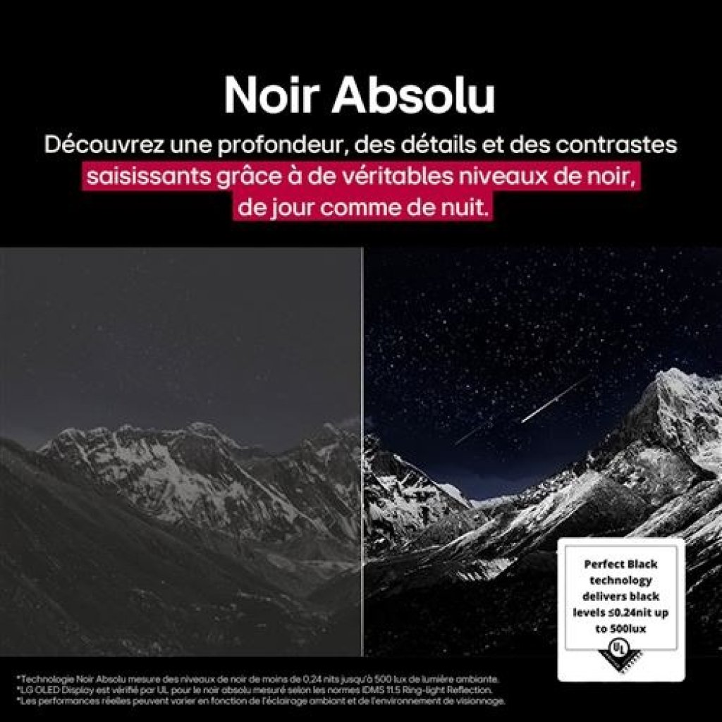 Les téléviseurs LG OLED EVO 2025 sont certifiés « Perfect Black » par UL. Cela signifie que nos téléviseurs affichent alors un noir absolu, faisant ressortir les couleurs qui composent l’image pour des contrastes infinis, et ce de jour comme de nuit. En effet, Les millions de pixels auto-émissifs qui composent les téléviseurs LG OLED sont capables de s’éteindre complètement afin de créer du noir.