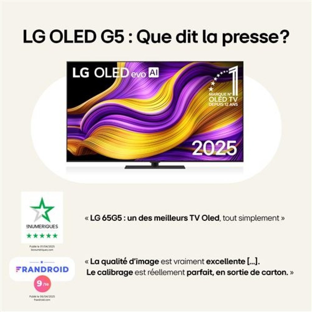 Pour les détenteurs de la carte Fnac+, le TV 55” (139 cm) LG OLED Evo OLED55G5 2025 passe à 1299€ au lieu de 1899€ (-32%).