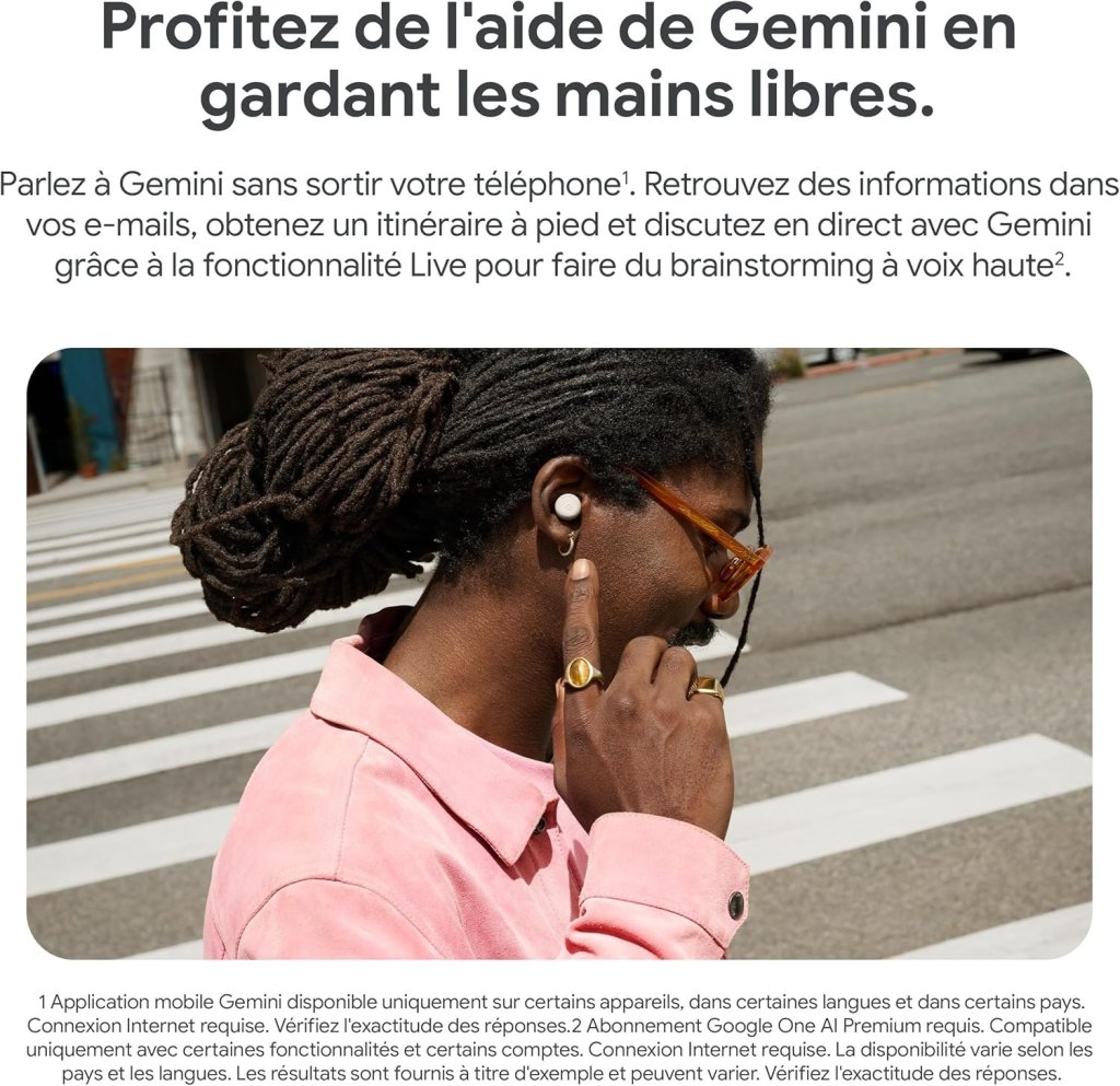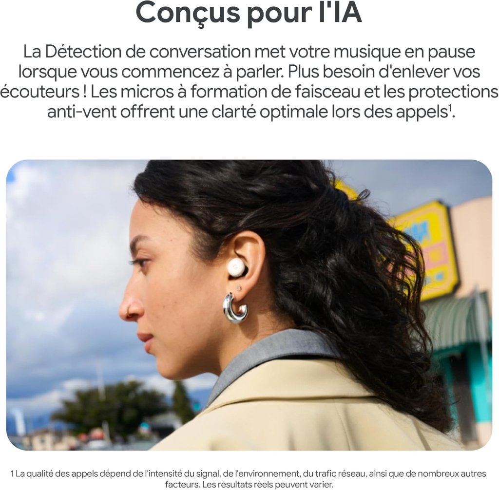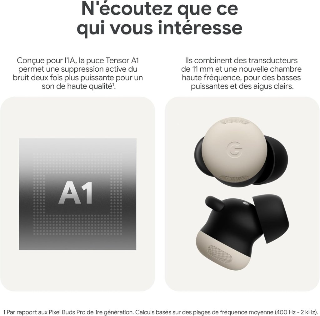 - Conçue pour l’IA, la puce Tensor A1 permet une suppression active du bruit deux fois plus puissante pour un son de haute qualité.