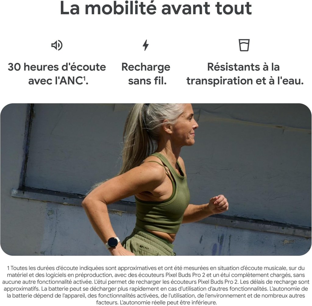 - 30 heures d’écoute avec l’ANC. Recharge sans fil. Résistance à la transpiration et à l’eau.