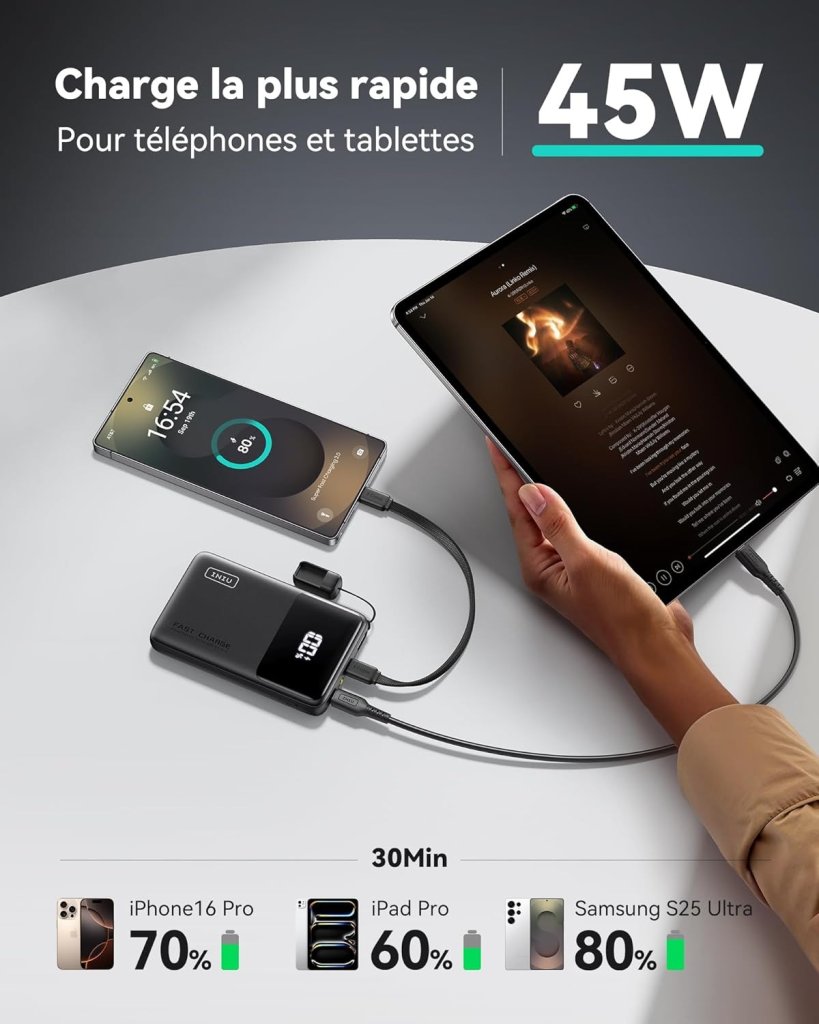 - Charge rapide à pleine puissance 45 W pour les derniers iPhone 16 et Samsung S24 : cette batterie externe offre une puissance de sortie pouvant atteindre 45 W et prend en charge les protocoles PD, QC et autres protocoles de charge rapide. En seulement 25 minutes, elle recharge votre iPhone 16 à 63 % et votre Samsung S24 Ultra à 73 %.