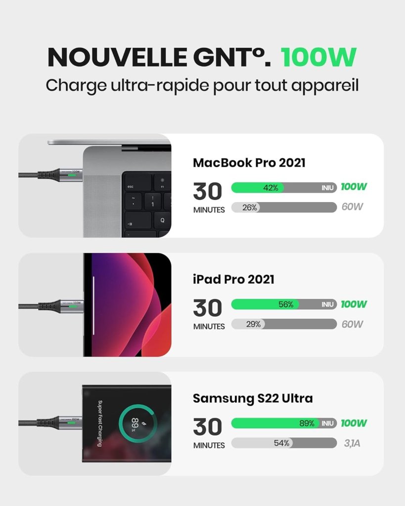 - 100W Livraison de Puissance Ultra Rapide: La technologie sans précédent 5A 100W PD prend la vitesse de charge au niveau supérieur-incroyablement alimentez votre Samsung S22 jusqu’à 89% en 35 minutes ou votre MacBook Pro jusqu’à 38% en seulement 30 minutes – soit 58 % plus vite qu’un câble de 60 W.