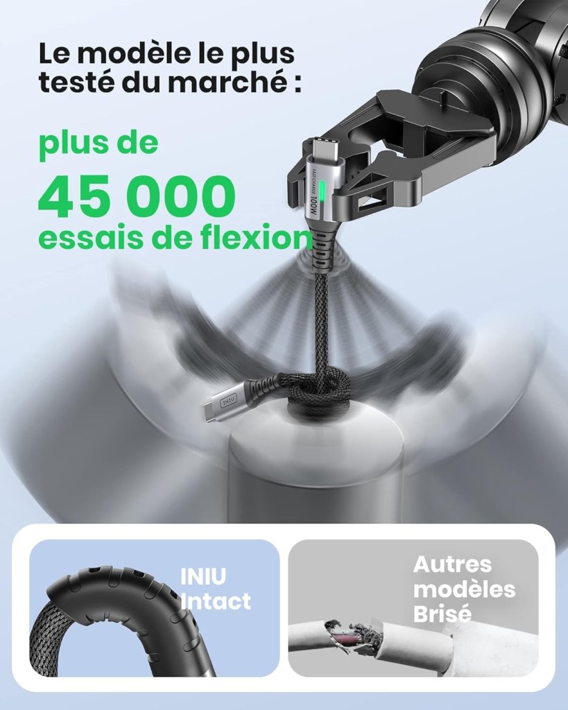 Sur Amazon, le câble USB C en nylon tressé INIU (2m, 100W, 5A, Charge rapide, PD 3.0 QC 4.0) est de nouveau disponible à 6,29€ au lieu de 11,99€.