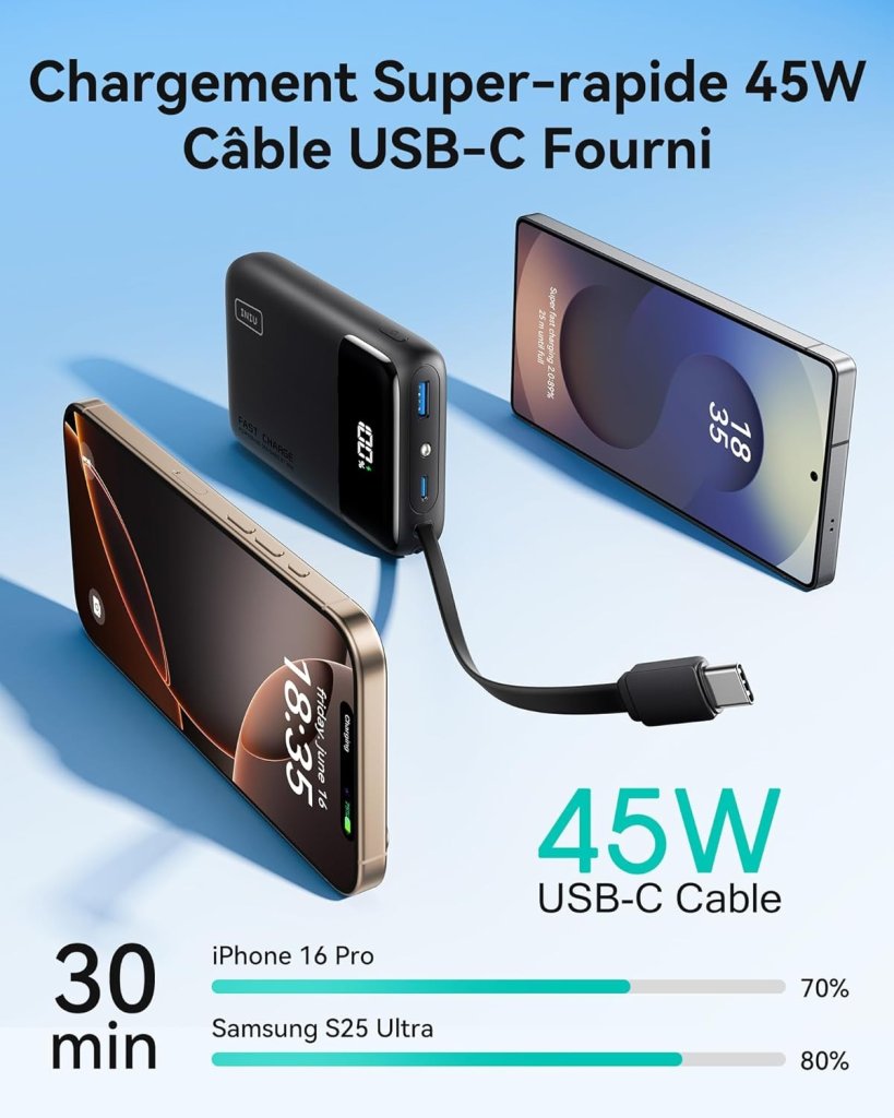 - Charge rapide 45W pour iPhone 16 et Samsung S25 Avec une sortie allant jusqu’à 45W, cette power bank prend en charge PD, QC et d’autres protocoles de charge rapide. Chargez votre iPhone 17 à 70% en seulement 25 minutes et votre Samsung S25 Ultra à 80%.