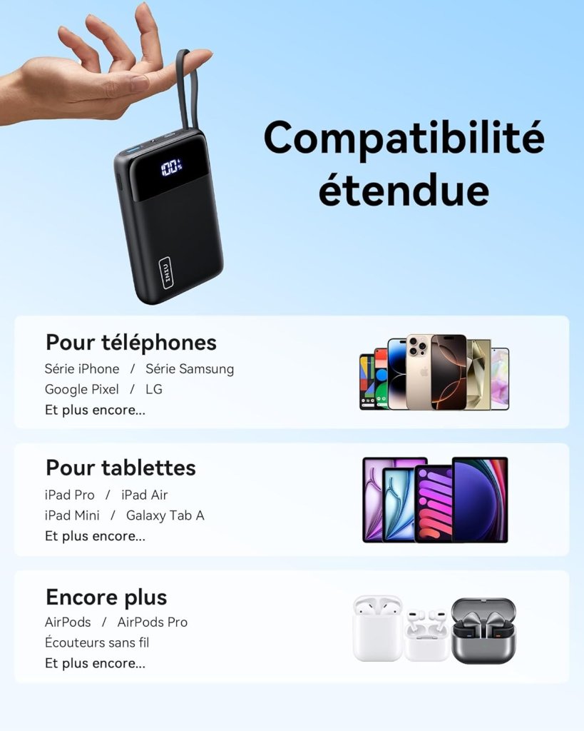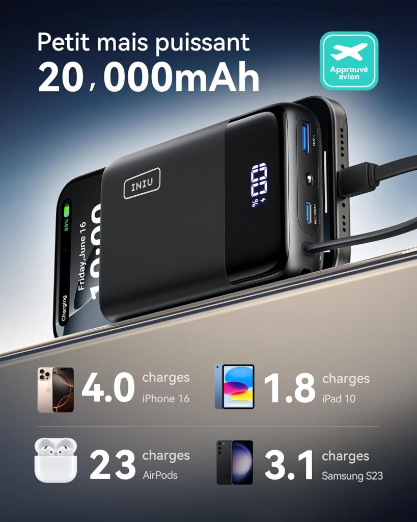 Bon plan ! La mini-batterie externe INIU 45W 20000mAh avec USB C (câbles intégrés) passe à 15,18€ au lieu de 29,77€ au moment de passer la commande !