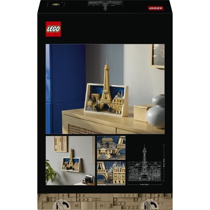 Exprimez votre fascination pour Paris et ses monuments célèbres avec le set de construction collector Paris, ville de l’amour LEGO Architecture (21064), à offrir à une femme ou un homme passionné.e par la ville de l’amour. Ce set d’exception ravira les fans de construction LEGO et les adultes créatifs.ives. La maquette à assembler est un cadeau original qui captivera les amateurs.trices d’histoire, de voyage et d’architecture parisienne. Explorez le ciel étoilé et la silhouette de la capitale. Découvrez les détails de la tour Eiffel, de Notre-Dame de Paris, de l’Arc de Triomphe et du Louvre. Ajoutez la brique décorée « City of Love » et le cadre en briques, puis exposez votre œuvre, accrochée au mur ou exposée sur une étagère ou un bureau. En réalisant ce tableau encadré, découvrez la construction enrichie avec l’application LEGO Builder proposant zoom, rotation du modèle, instructions en 3D, sauvegarde et suivi de la progression. DIMENSIONS – Ce set, source d’inspiration et de sérénité, propose une représentation artistique du paysage urbain de Paris et mesure plus de 30 cm de haut, 27 cm de large et 5 cm de profondeur. Le kit contient 958 pièces.