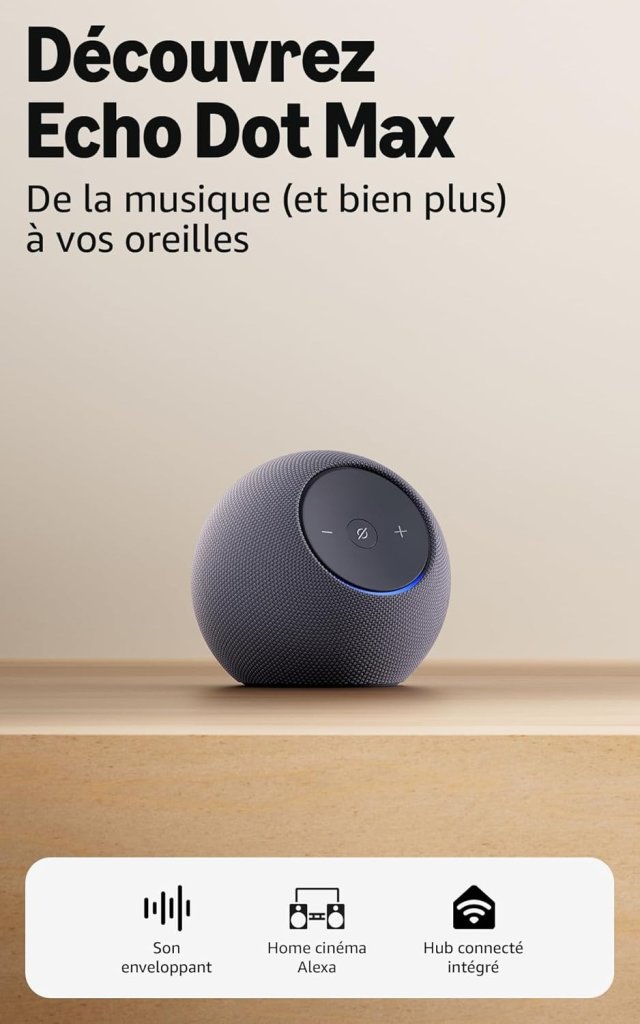 - Découvrez Echo Dot Max : le dernier-né de la gamme qui maximise les performances audio d’Echo Dot pour livrer un son riche qui emplit l’espace, s’adapte automatiquement à l’acoustique de votre pièce et optimise la lecture. Il est également doté d’un hub connecté intégré, de la technologie Omnisense pour un environnement optimisé, ainsi que d’une puce AZ3 pour des performances de rapidité optimales.