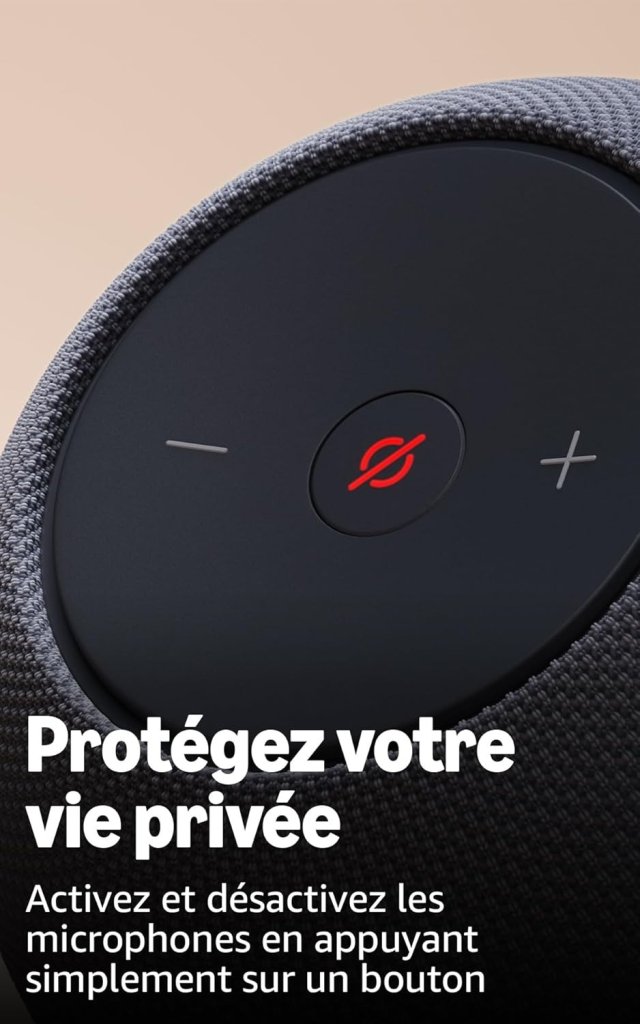 - Conçu pour protéger votre vie privée : Amazon n’a pas pour vocation de vendre vos informations personnelles à des tiers. Cet appareil est conçu avec de multiples éléments de contrôle de vos informations personnelles, dont un bouton Activer/désactiver les microphones.