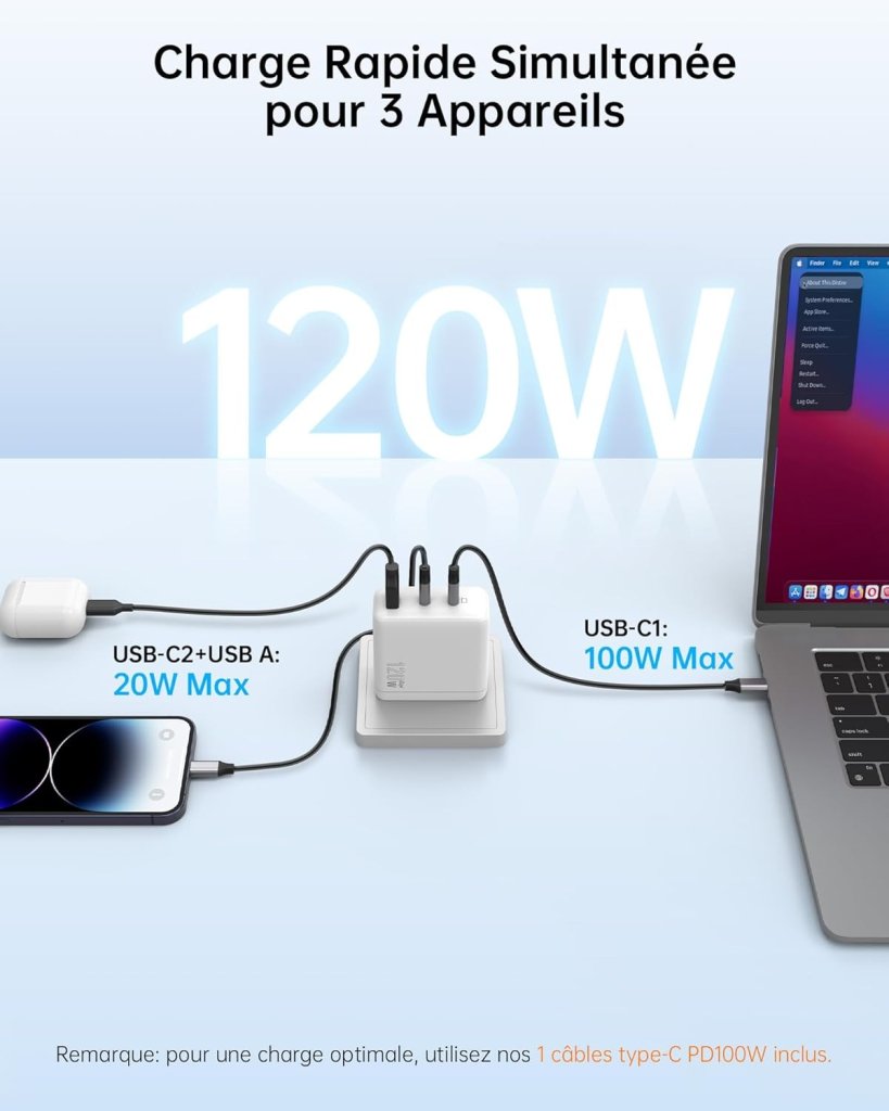 - Charge rapide de 120W pour 3 appareils: NOVOO Chargeur USB-C pour alimenter votre ordinateur portable, tablette et téléphone simultanément. Remarque 1: Pour charger un ordinateur portable, utilisez le port USB-C1 supérieur. 2: Lors de la connexion de plusieurs appareils, le chargeur assure la sécurité avec 2 à 3 brèves pauses avant d’entrer dans la charge rapide, sélectionnant le bon protocole à chaque fois.