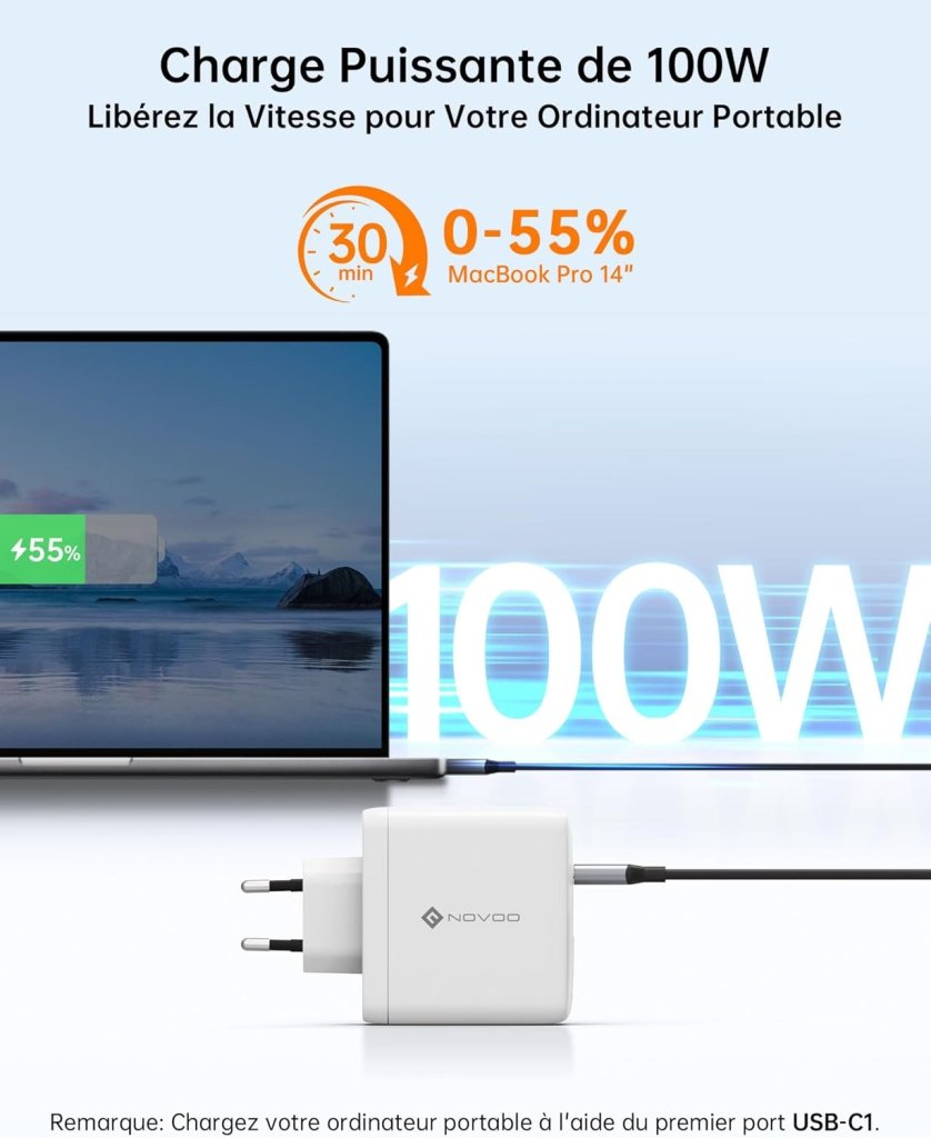 - Améliorez l’efficacité du chargeur avec 1 câbles PD 100 W: Adaptateur USB-C avec 1 câbles PD 100W Type-C inclus redéfinit la vitesse de charge pour ordinateurs portables. Le MacBook Pro 14″ atteint 55% de batterie en 30 minutes de charge seulement, mettant en évidence l’efficacité du chargeur USB-C NOVOO. Remarque: Doublez la vitesse de charge et utilisez simultanément les ports USB-C et USB-A pour un débit maximal de 100W.