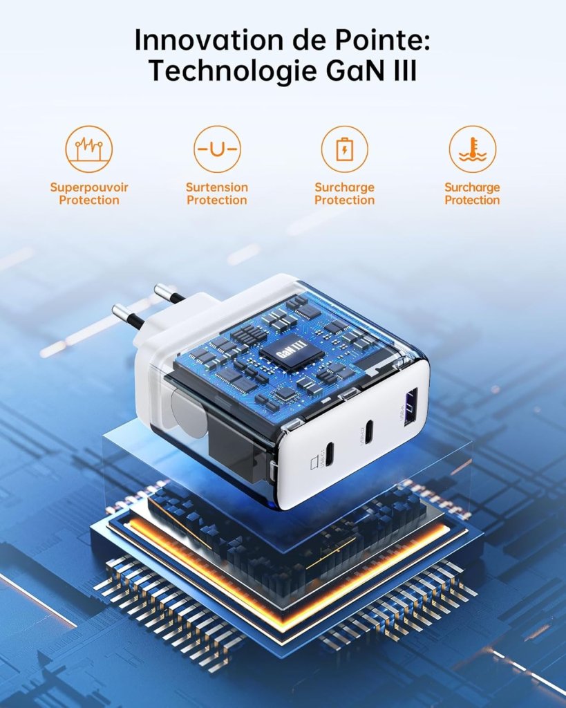- Sécurité avancée avec la technologie GaN III: NOVOO chargeur GaN III certifié PSE, CE, ETL, FCC et RoHS est équipé de protections contre les surtensions, les surcharges et les surchauffes pour garantir une charge sûre.