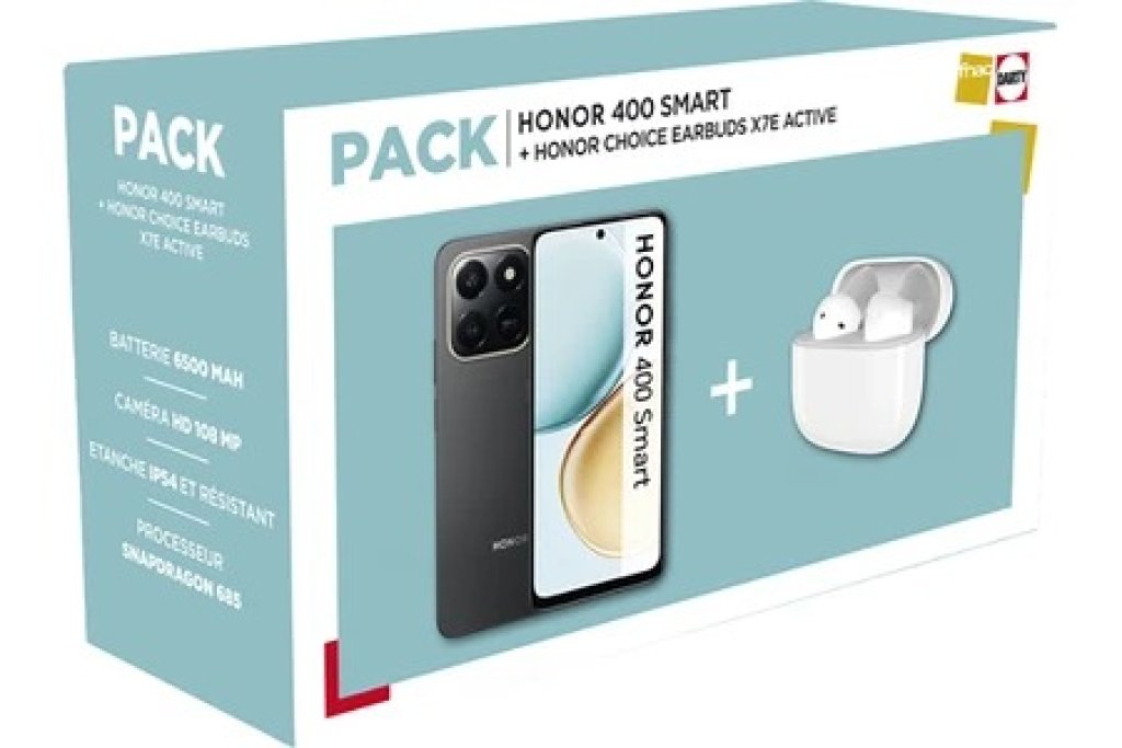 Très bon prix chez Darty pour ce pack Honor qui contient le Smartphone Honor 400 Smart 4G 6/128 et les écouteurs Bluetooth Honor Choice Earbuds X7E Active : 159,90€ au lieu de 199,90€