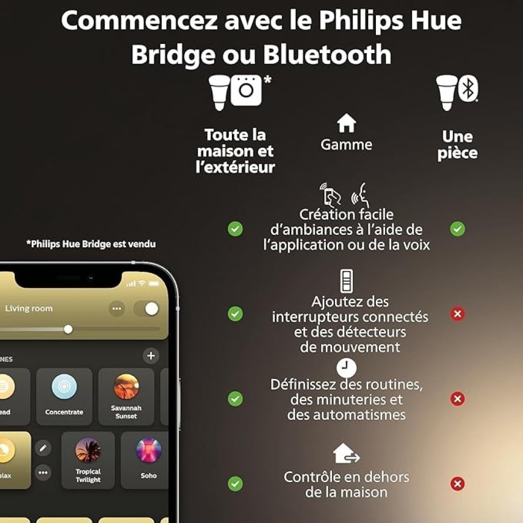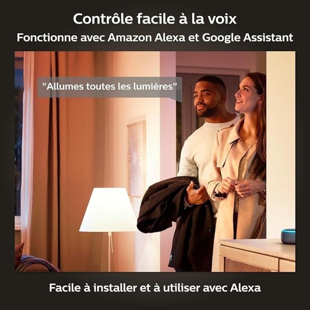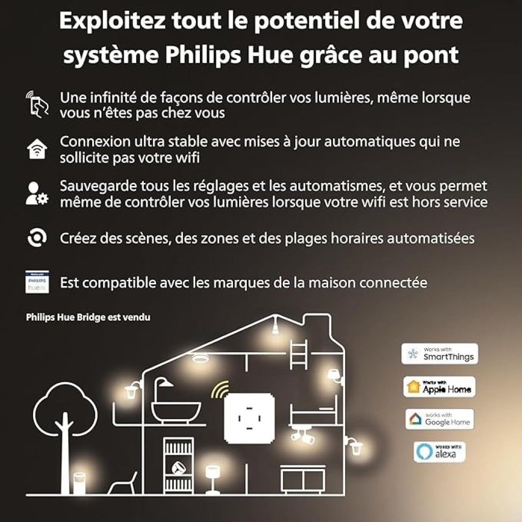 - CONTROLE À DISTANCE – Commandez votre éclairage à distance à l’aide de l’application Hue primée ou ajoutez un Hue Bridge pour le contrôler à l’aide de votre assistant domestique préféré. Compatible avec Alexa, Google Assistant et Apple Home