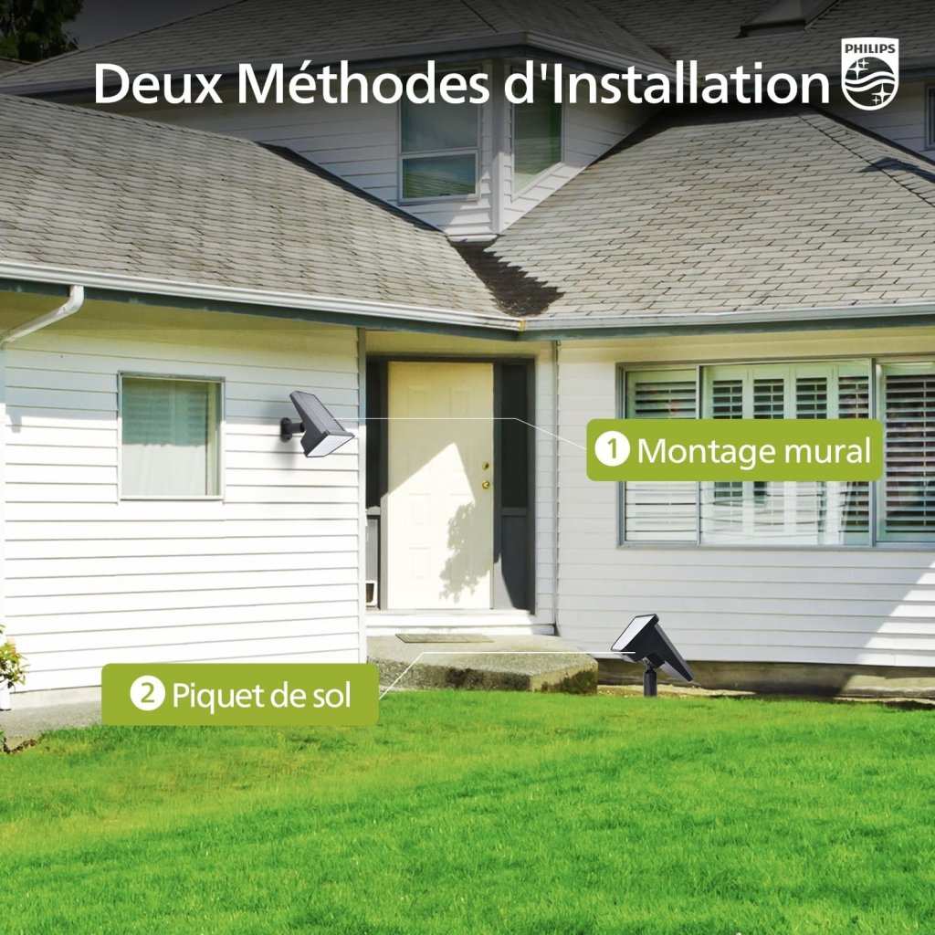 - FONCTION 2 EN 1 ET INSTALLATION FACILE – La lumière solaire Philips offre une double fonctionnalité : elle peut servir à la fois de spot d’éclairage paysager et de lumière murale, vous offrant des options d’éclairage flexibles pour tout espace extérieur. Aucun câblage, aucune complication – placez, installez et profitez instantanément d’une ambiance chaleureuse !