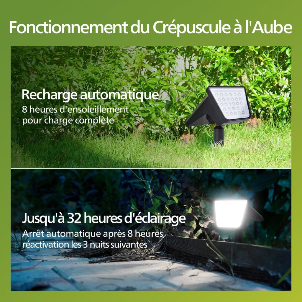 - FONCTIONNEMENT DU CRÉPUSCULE À L’AUBE – La lumière détecte automatiquement les changements de luminosité naturelle, s’allumant au crépuscule et s’éteignant à l’aube. Il suffit ensuite d’activer l’interrupteur pour profiter d’un éclairage automatique. (Fonctionne jusqu’à 32 heures par charge complète de 8 heures ; arrêt automatique après 8 heures, reprise les 3 nuits suivantes – une seule charge alimente quatre nuits.)