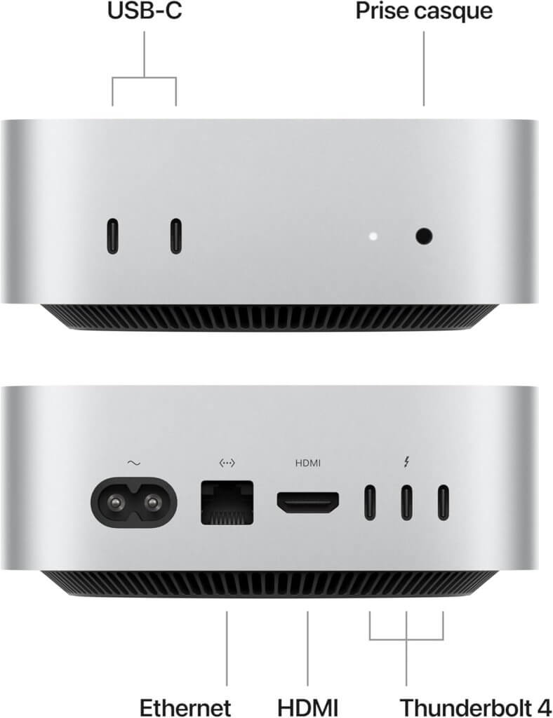 Puce M4, CPU 10 cœurs et GPU 10 cœurs – Conçu pour Apple Intelligence – 16Go de mémoire unifiée, 256Go de Stockage SSD – Gigabit Ethernet.