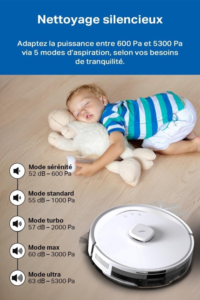 - NETTOYAGE SILENCIEUX 52 dB – Cet aspirateur robot fonctionne en mode silencieux jusqu’à 52 dB pour un nettoyage discret dans toute la maison