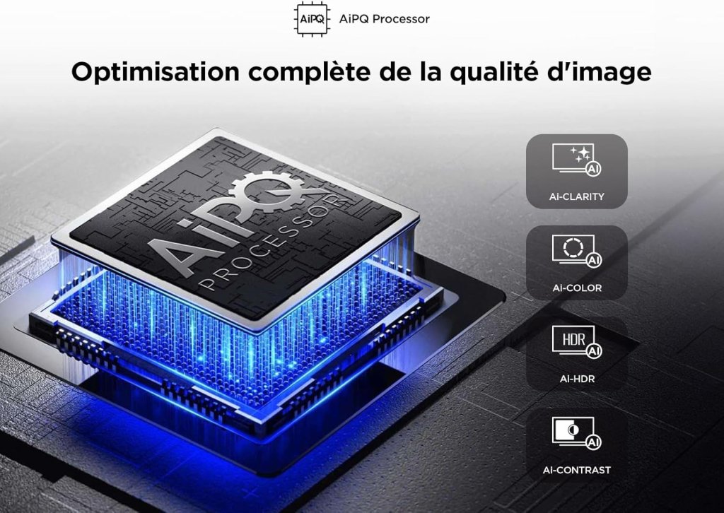 - AiPQ Processeur : L’algorithme TCL activé par AiPQ traite les contenus avec une qualité 4K stable et élevée, des mouvements clairs et fluides, un contraste élevé et les détails les plus fins.