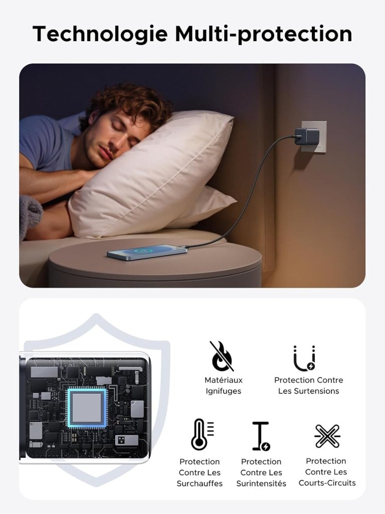 - [ Charge Fiable et Sûre ] Ce 45W adaptateur secteur USB-C est équipé de la technologie ThermalGuard qui surveille les températures de charge en temps réel afin de protéger votre appareil contre les courts-circuits, les surtensions, les surchauffes et les surintensités, il assure vous et votre appareil en toute sécurité.