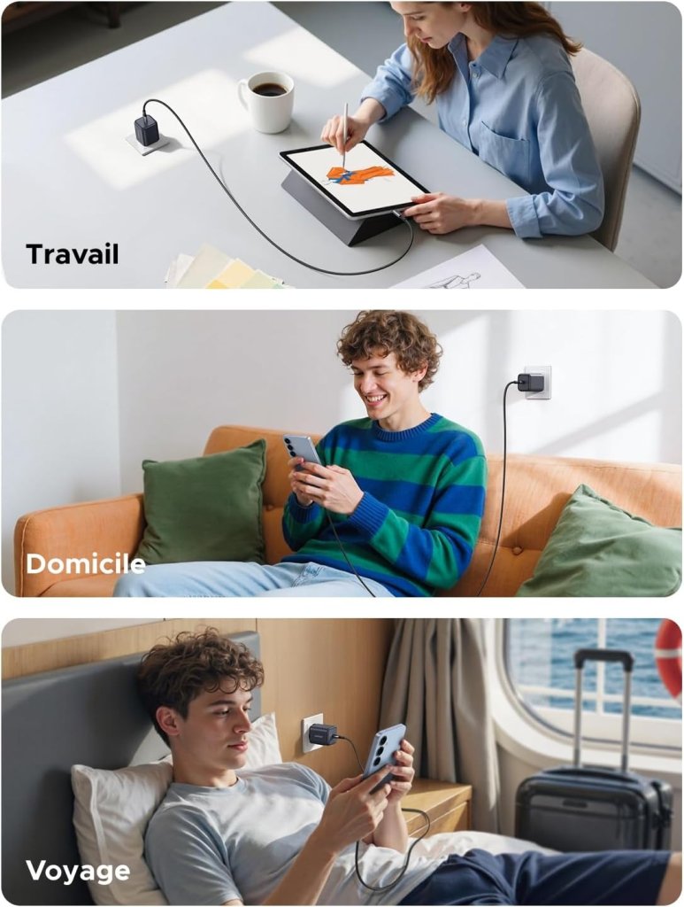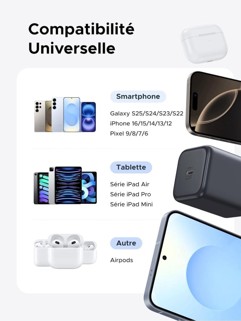 - [ Compatibilité Universelle ] Ce chargeur 45W USB-C est compatible avec Galaxy S25/ S25+/ S25 Ultra/ S24/ S23/ S22/ S21/ A16/ A15/ A05s/ A06/ A55/ A34, iPhone 17/ iPhone 17 Air/ iPhone 17 Pro/ iPhone 17 Pro Max/ 16/ 15/ 14/ 13/ 12/ 11, Galaxy Tab S10 Ultra/ S10+/ S9/ S8/ S7/ A9+/ A9/ A8/ A7, MacBook Air/ Pro M4 M3 M2 M1, Pixel 9/ 8/ 7/ 6, iPad Pro/ Air/ mini, Steam Deck, etc.