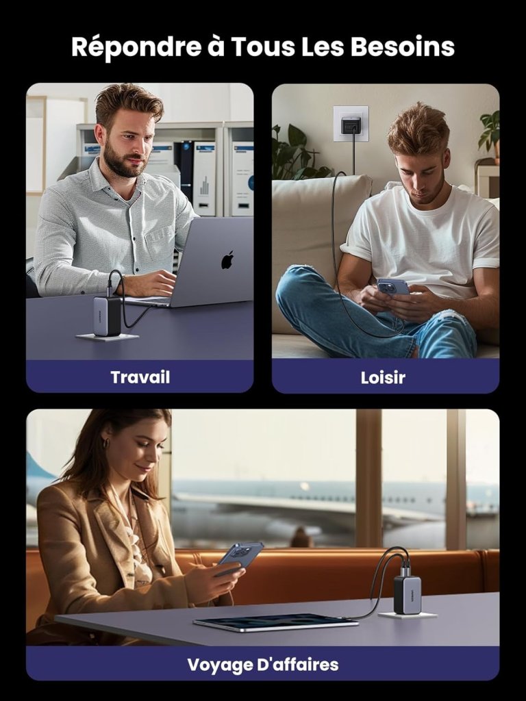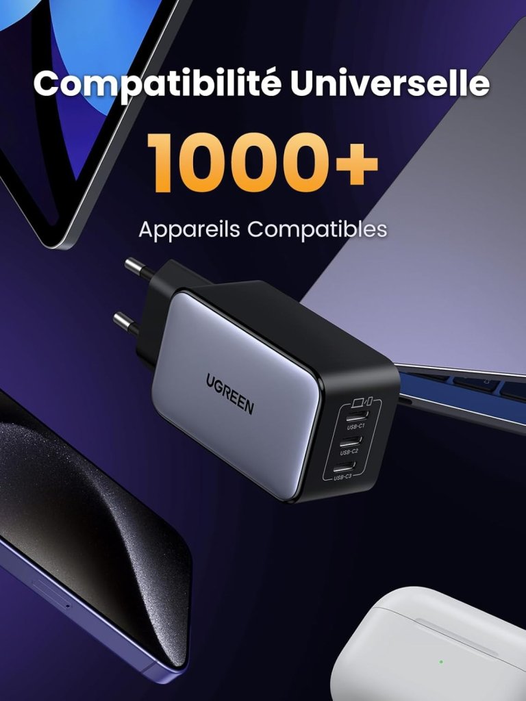 - [ Compatibilité Universelle ] Cette prise secteur USB-C est compatible avec iPhone 17/ iPhone 17 Air/ iPhone 17 Pro/ iPhone 17 Pro Max/ 16/ 16e/ 16 Plus/ 16 Pro/ 16Pro Max/ 15/ 14/ 13/ 12/ 11, Galaxy S25/ S25+/ S25 Ultra/ S24/ S23/ S22/ S21, Galaxy A15/ A25/ A35/ A55/ A05s, Pixel 9/ 8/ 7/ 6, MacBook Air/ Pro M4 M3 M2 M1, iPad Pro/ Air/ mini, Galaxy Tab, Steam Deck, etc. (Petit conseil : il supporte Galaxy 45W)