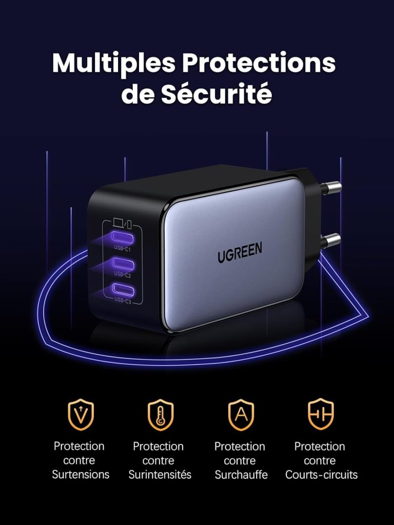 - [ Charge Intelligente ] Compatible avec plusieurs protocoles (PD 3.0, Galaxy PPS 45W/ 25W, QC 4+/ 4.0/ 3.0, FCP), ce chargeur triple USB-C ajuste automatiquement le courant pour chaque appareil. Une solution intelligente pour tous vos besoins de charge rapide.