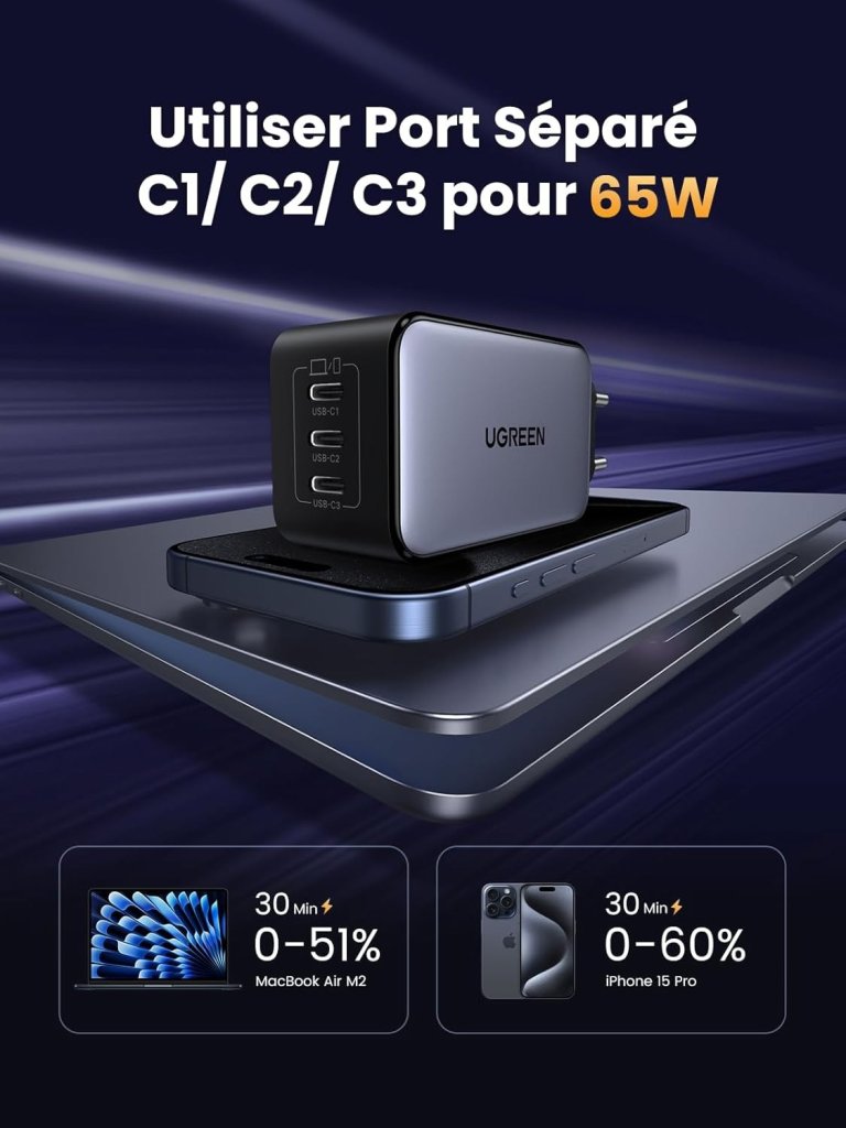 - [ Performance Éblouissante ] Grâce à la puce GaNInfinity de nouvelle génération, profitez d’une puissance maximale de 65W sur chaque port USB-C. Chargez votre MacBook Air M2 à 51 % ou votre iPhone 15 Pro à 60 % en seulement 30 minutes (avec un unique port).